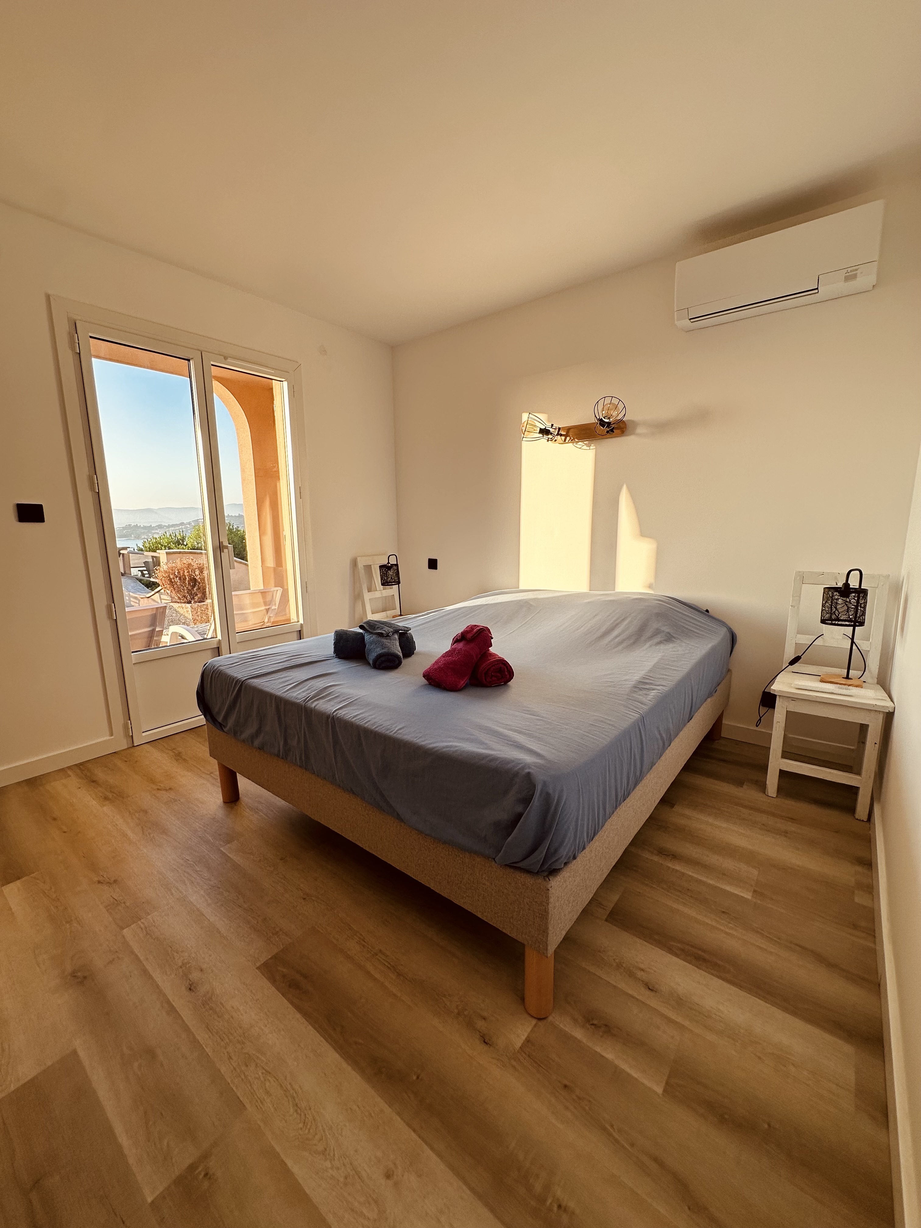 La chambre 1 donne sur la terrasse et présente une vue sur la mer – équipée d’une armoire – penderie et d’un lit double 160*200