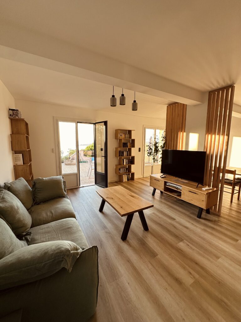 Le séjour (outre la cuisine – cf page dédiée) est équipé d’une table* (avec chaises) , d’un canapé * (convertible si besoin) et d’une TV* avec accès chaines TNT et Disney Plus.