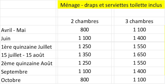 La fourniture du linge de toilette (gant et serviette de toilette), des draps (+ couette) ainsi que le ménage de l’appartement sont inclus dans la tarification ci dessous.